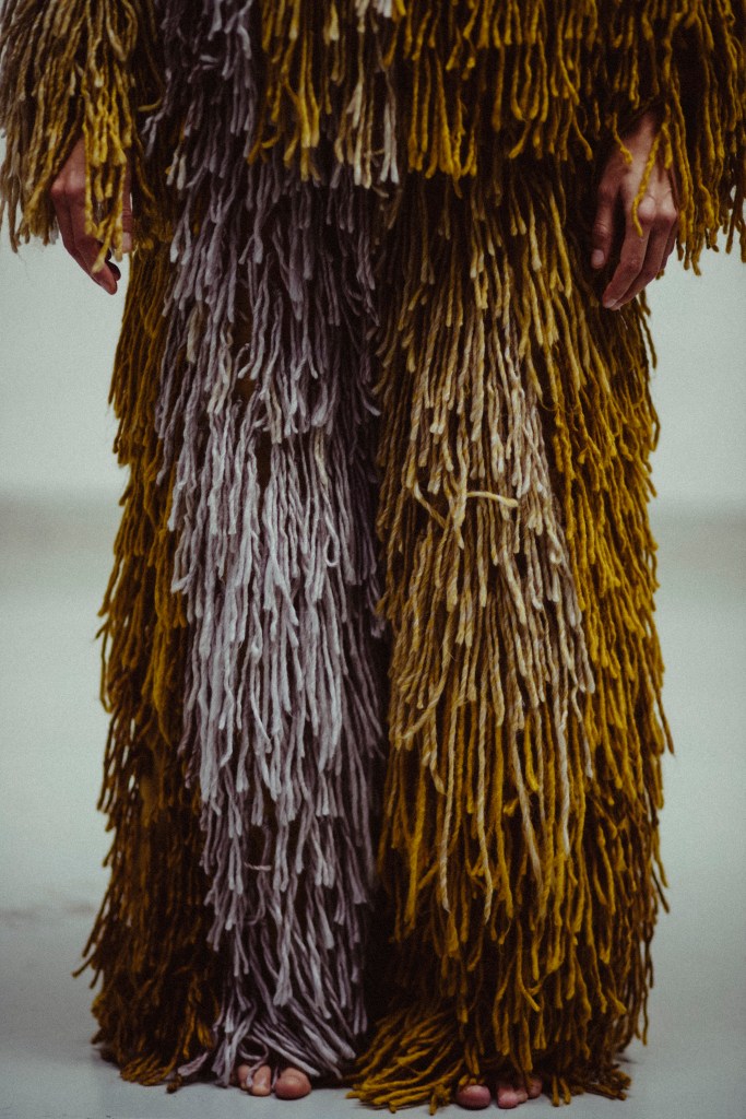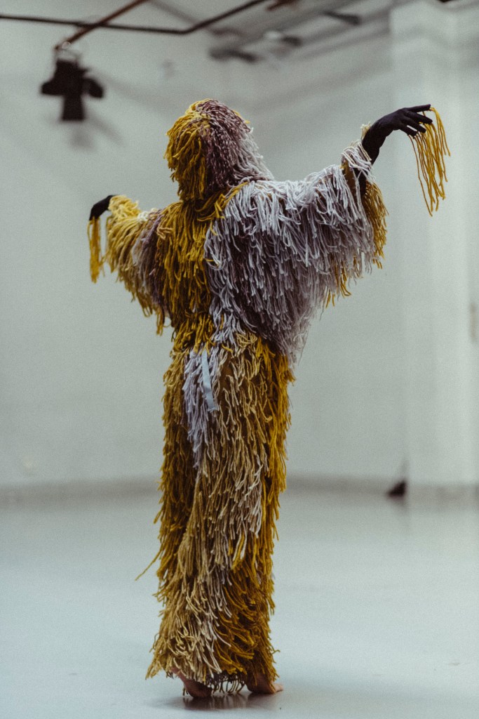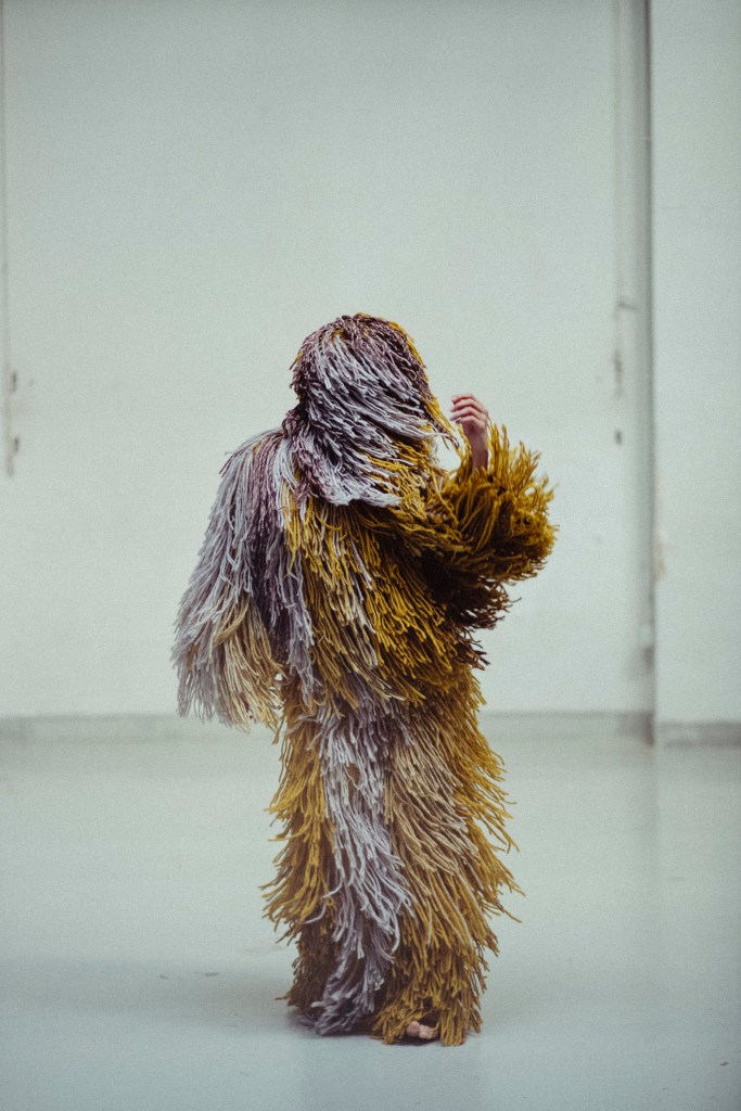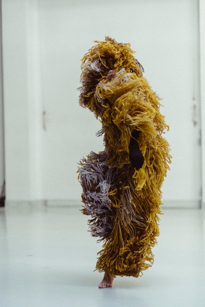 El vestuario se compone de un mono intervenido y un traje a medida de mostrua en triacetato y pelo a pelo con lana de alpaca de forma completamente artesanal para resaltar el movimiento de la bailarina. el traje esta elaborado un una gama de colores en degradé desde los amarillos, grises y tonos más oscuros. pieza única. Registro en foto de vanessa martins.