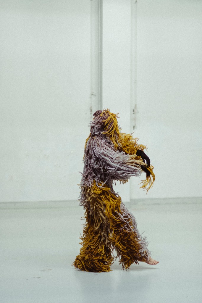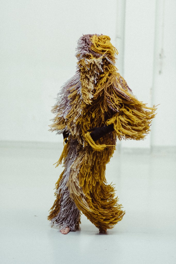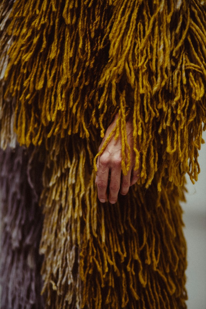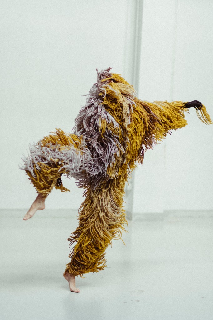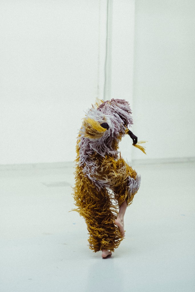 El vestuario se compone de un mono intervenido y un traje a medida de mostrua en triacetato y pelo a pelo con lana de alpaca de forma completamente artesanal para resaltar el movimiento de la bailarina. el traje esta elaborado un una gama de colores en degradé desde los amarillos, grises y tonos más oscuros. pieza única. Registro en foto de vanessa martins.
